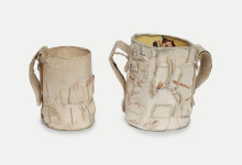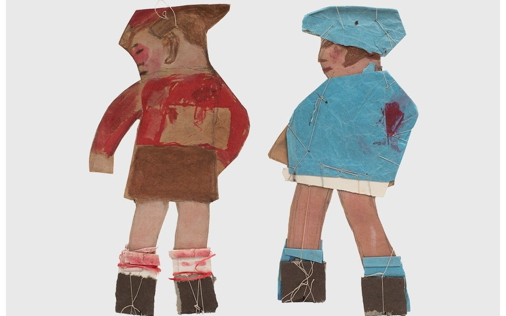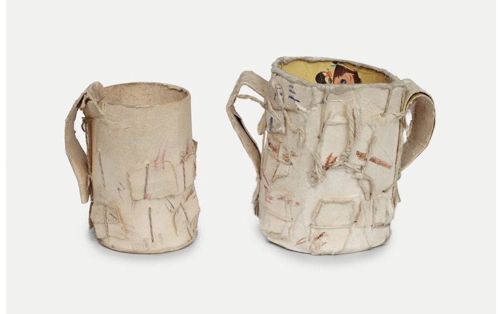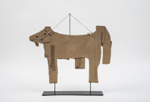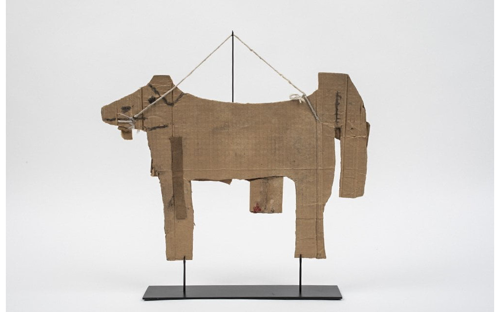 This pram, or baby carriage, shows Castle’s use of numerous layers of cardboard that give this work added dimension. Thick twine and string woven through the cardboard provide structural support.