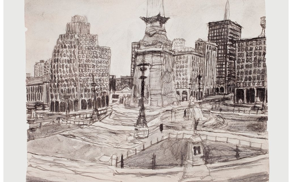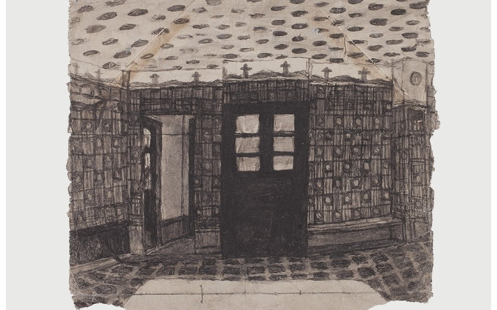 It is unknown whether this drawing depicts an actual scene, or one composed from Castle’s imagination. He often presented objects in unusual or atypical places within the pictorial space of his drawings, e.g. the ladder in the center of the room.